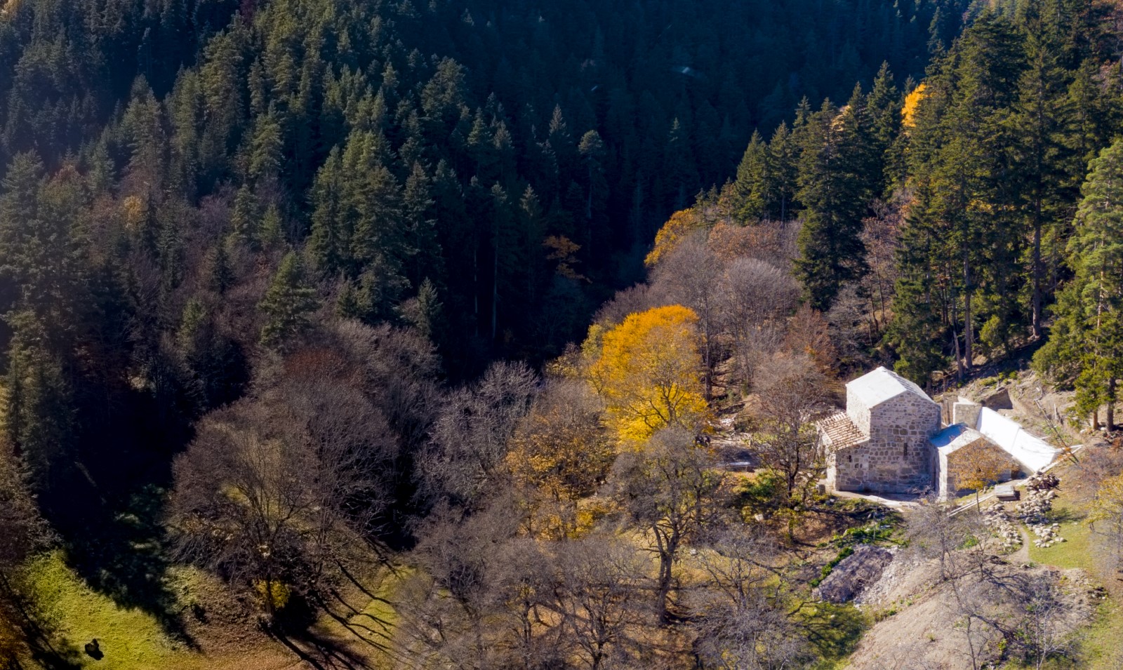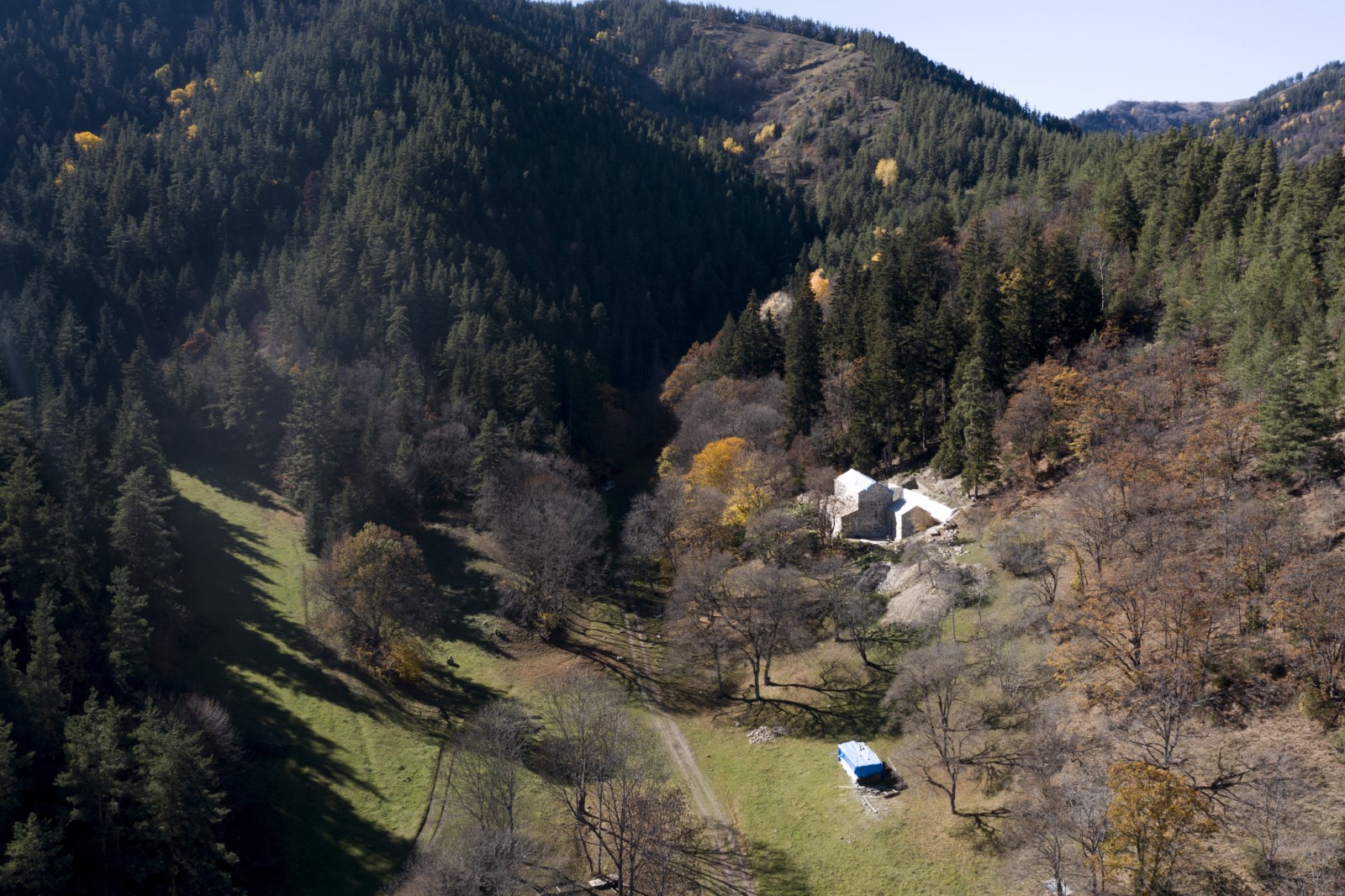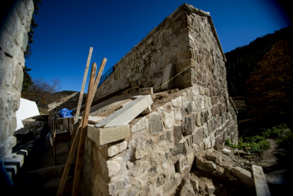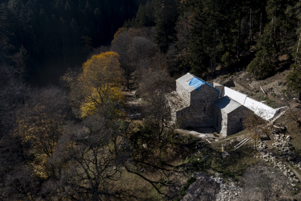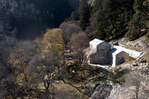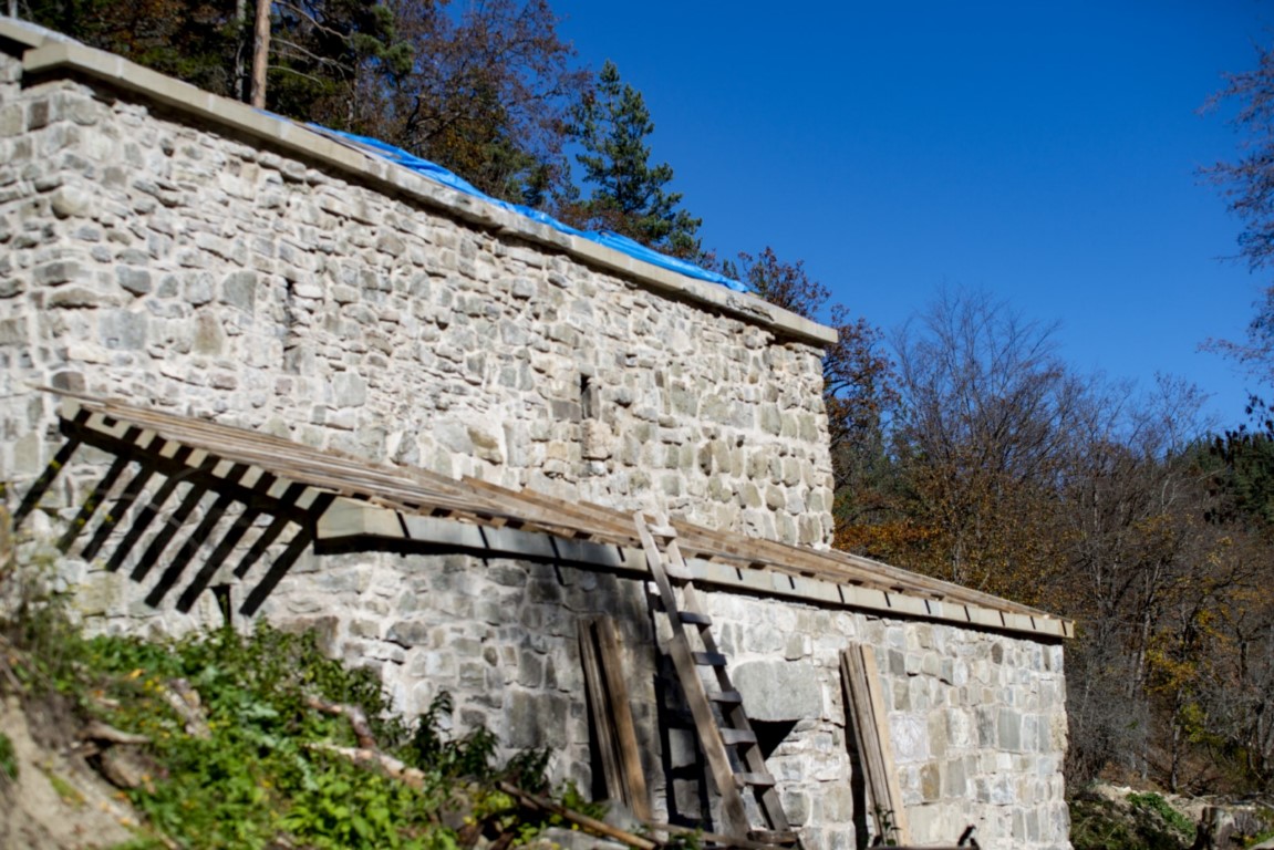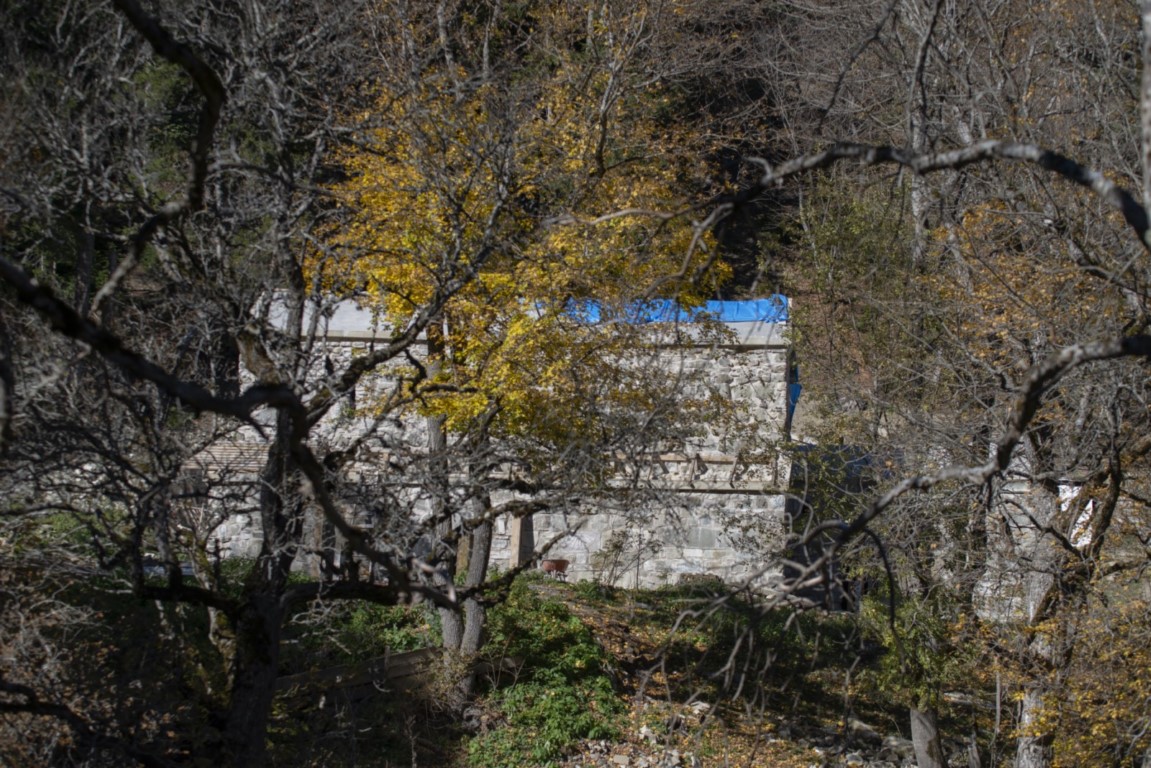 დიდი ზომის ეკლესია დარბაზულია სამხრეთისა და ჩრდილოეთის მინაშენებით. ეკლესიის ინტერიერი მოხატული იყო. აფსიდზე შემორჩენილია ფრესკის ფრაგმენტები. ფრესკები XII ს-ისაა. შიდა სივრცე აზიდულია. სამხრეთის მინაშენი დანგრეულია. ჩრდილო მინაშენი ორი ნაწილისგან შედგება: აღმოსავლეთის - შედარებით მცირე სათავსია სწორკუთხა კედლითა და მასში გაჭრილი სარკმლით, ხოლო დასავლეთის - საძვალეს წარმოადგენს. დასავლეთ ფასდზე, ფრონტონის კეხზე ორნამენტებია. ეკლესიას გადანაკეცებიანი კარნიზი აქვს. დიდ ეკლესიას ჩრდილო_აღმოსავლეთის მხრიდან მიდგმული აქვს შედარებით მცირე, დარბაზული ეკლესია. ხელოვნების მუზეუმში დაცულია ეკლესიიდან წაღებული XV ს-ის ხის კანკელი.